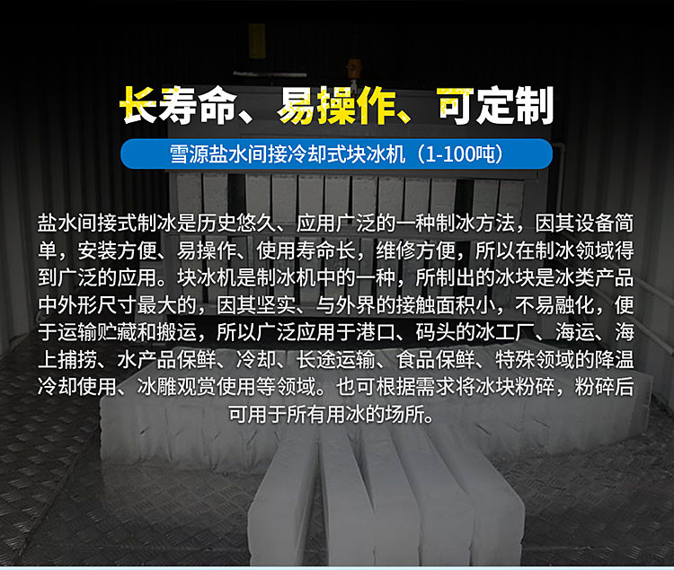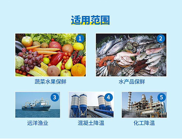 用于水产加工,食品加工,蔬菜水果保鲜,远洋捕捞等食品行业,混泥土搅拌站,道路桥梁施工,水电站大坝浇筑等等